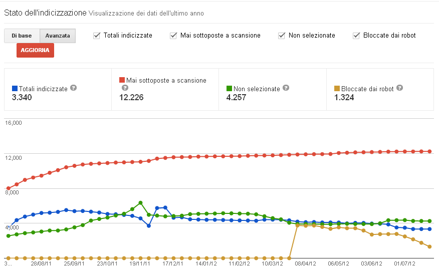 Altro dato che necessita a mio parere di maggiori spiegazioni da parte di Google è quello riguardante le Pagine Sottoposte a Scasione Finora. Il numero indicato per quasi tutti i clienti che seguiamo è decisamente elevato, nel caso qui sopra citato, è 4 volte superiore al numero di pagine indicizzate.