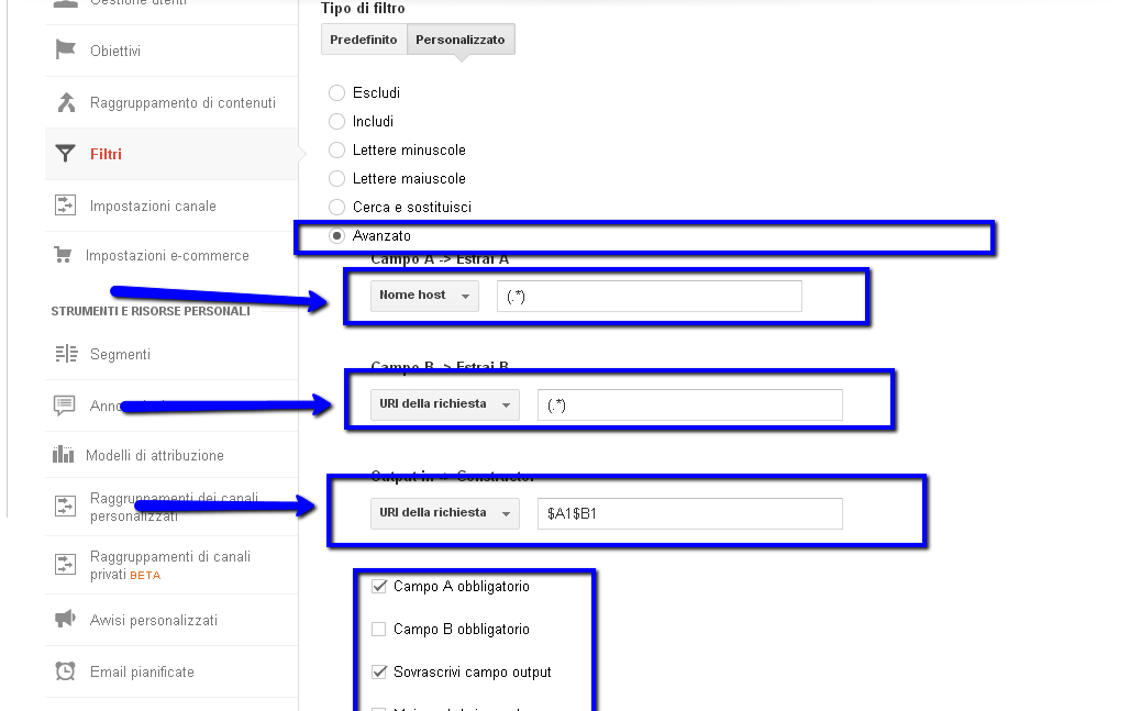 Quelle che vedete qui sopra sono le configurazioni corrette per monitorare i sotto-domini con un solo account Google Analytics. Sostanzialmente il filtro effettua le seguenti operazioni: